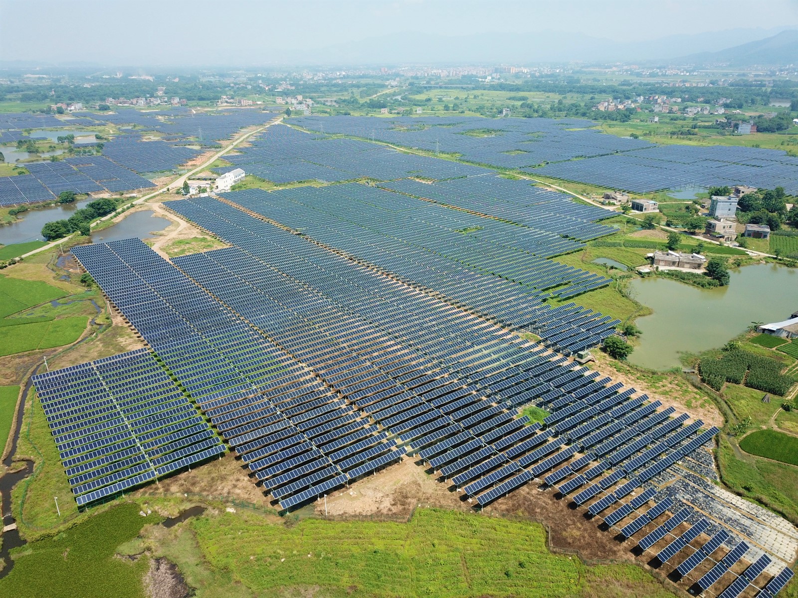 在广西壮族自治区桂平市中部偏西,坡地上一大片高高架起的光伏蓝板排列有序、十分显眼,空中俯瞰犹如一汪蓝色海洋,蔚为壮观,与四周环绕的绿色田野构成了一幅壮美和谐的生态画卷。