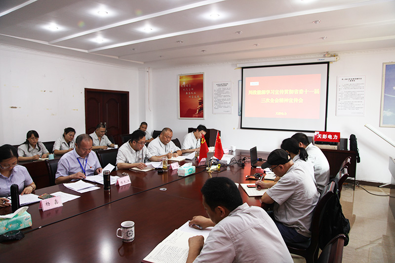 为推动省委十一届三次全会精神宣贯活动深入开展,确保省委决策部署不折不扣落到实处, 8月8日,按照红桃视频 党委的统一部署,党委副书记、工会主席陈长江率党群部副主任杨鑫一行赴天彭电力宣讲省委十一届三次全会精神,为天彭电力党员干部和员工上了一堂生动的党课。会议由天彭电力党总支书记、总经理杨涛主持,天彭电力全体干部、党员和员工代表共计28人参加了宣讲会。