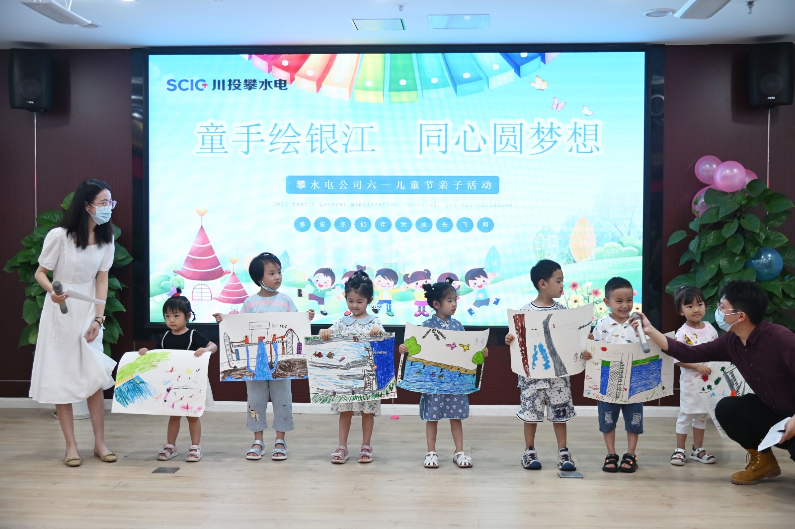 绘画完成后,小朋友们拿着自己的画作上台展示,介绍自己的画作。“这是银江水电站、这是水、这是两边的山和树”,两三岁的的小朋友已经知道了银江水电站的基本外貌;“这是鱼道、这是厂房、这是大坝”“这是导流明渠、这是坝顶门机”,很多年纪大一点的小朋友则对银江水电站的基本结构有了相当深入地解,时不时冒出的水电专业术语赢得评委和观众的阵阵欢呼。由公司领导组成的评委为所有参加的小朋友颁发了奖牌和奖品。活动最后,小朋友们积极踊跃报名,进行了个人才艺展示,现场充满了欢乐的气氛,个个兴高采烈,掌声不断。