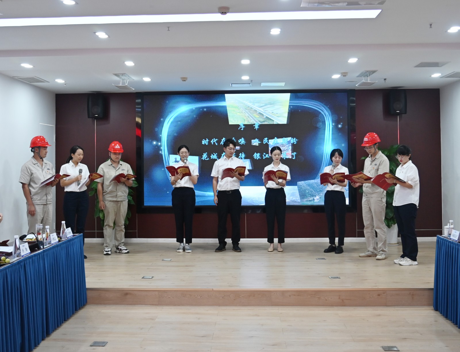 会议在公司青年职工精心准备的诗歌朗诵“银江组歌”中拉开帷幕,“时代在呼唤,人民在期盼。花城在等待,银江我来了……”公司各部门员工代表以朗诵的方式声情并茂的讲述了银江水电站自2019年7月开工建设三年历程,赢得了参会人员的阵阵掌声。