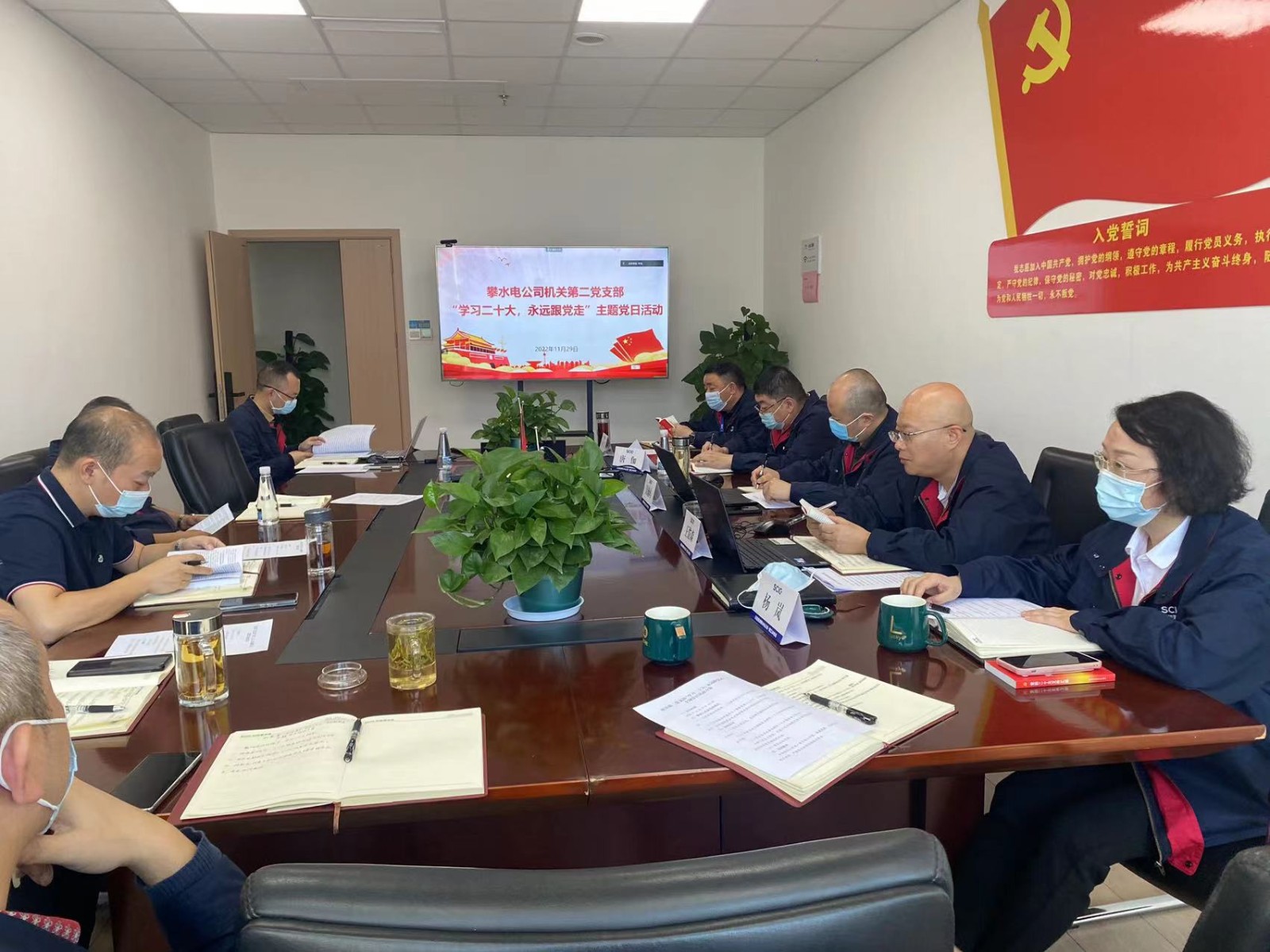 旗帜指引方向,信心凝聚力量。11月29日,攀水电公司机关第二党支部采取线上与线下相结合的方式组织开展“学习二十大,永远跟党走”主题党日活动,所属党员、非党中干及入党积极分子20人参加活动,党总支副书记、总经理吴巍屿等5名领导班子成员、党总支委员落实“双重组织生活”要求,以普通党员身份参加活动。