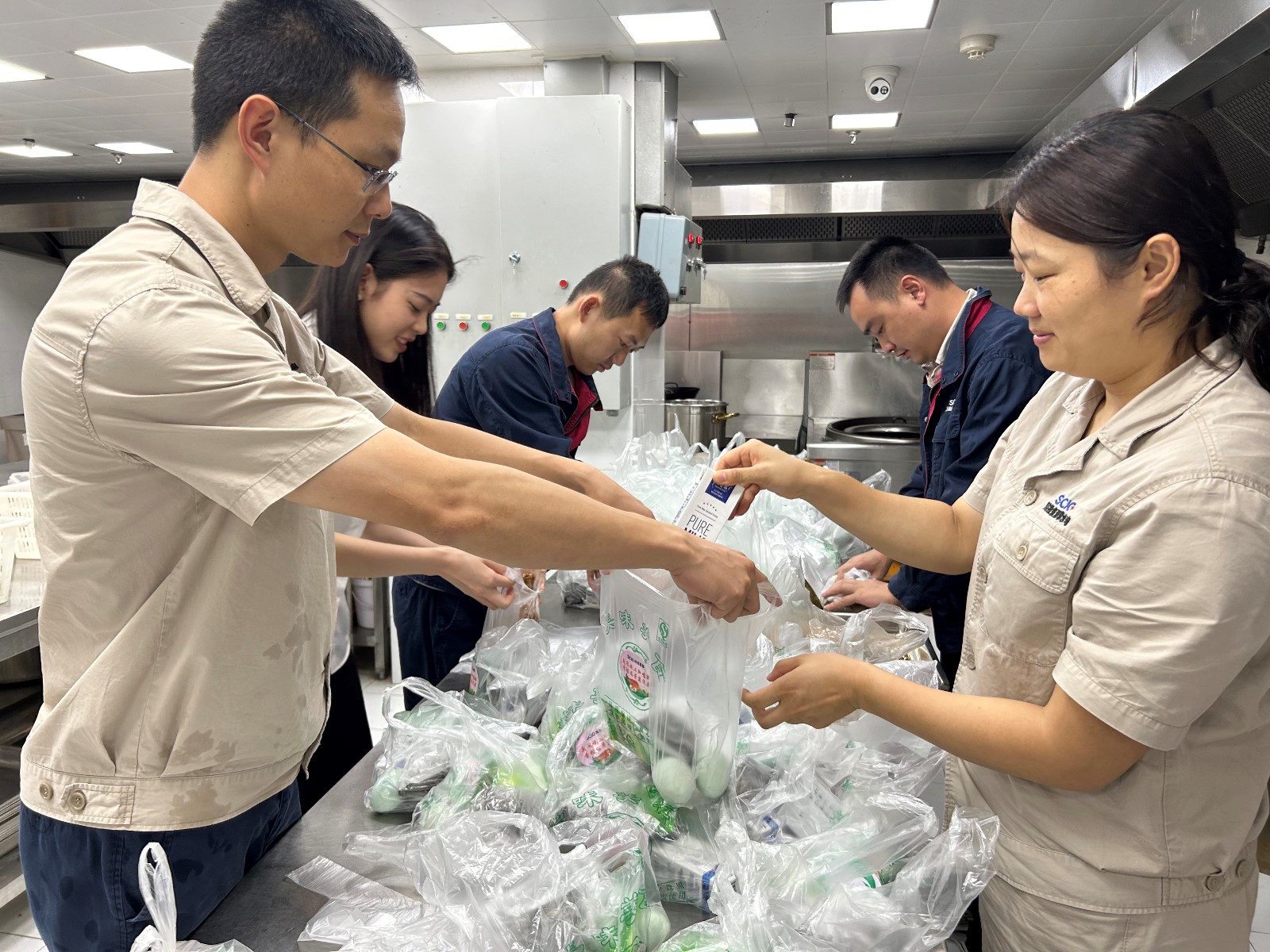 支部党员、志愿者们放弃了难得的节日假期,下午就在职工食堂忙碌了起来,卤鸡腿,蒸粽子,煮盐蛋,采用流水线工作方式,把热乎乎的鸡腿、粽子、盐蛋、牛奶等提前进行分装,方便工友们在工地食用。