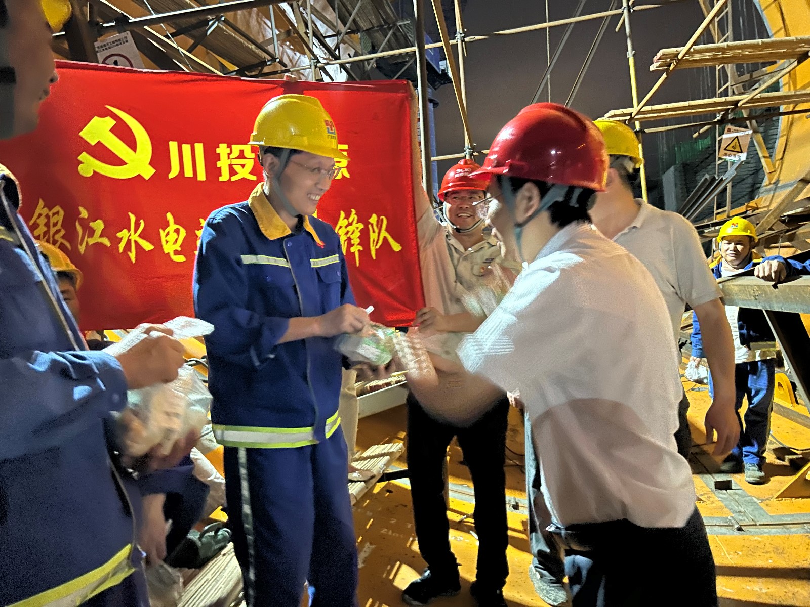 节日的银江水电站施工现场,大坝混凝土浇筑、厂房尾水管机电安装、混凝土拌和系统等各部位一片忙碌,为按期实现各项节点目标,800余名建设者依然奋战在银江水电站施工现场。夜晚的工地更是灯火通明,晚上九点,红桃视频 副总经理,公司党总支书记、董事长徐孝刚带领公司党员先锋队、志愿者服务队,深入混凝土浇筑仓面、尾水管、拌合楼调度室、防汛值班室、变电站、保安亭等部位,将热乎乎的鸡腿、香喷喷的粽子等慰问品送到正在施工的每位工友手上。徐孝刚讲到:“端午节是中华民族重要的传统节日,对大家坚持奋战在银江水电站施工现场斗酷暑、战高温、挑灯夜战表示感谢,祝福大家端午安康!”活动中,徐孝刚还开展了夜间安全检查,叮嘱大家做好防护、确保施工安全。