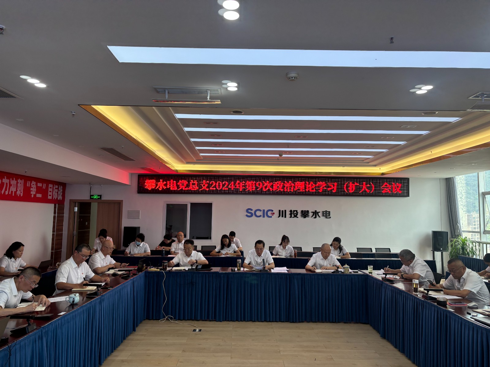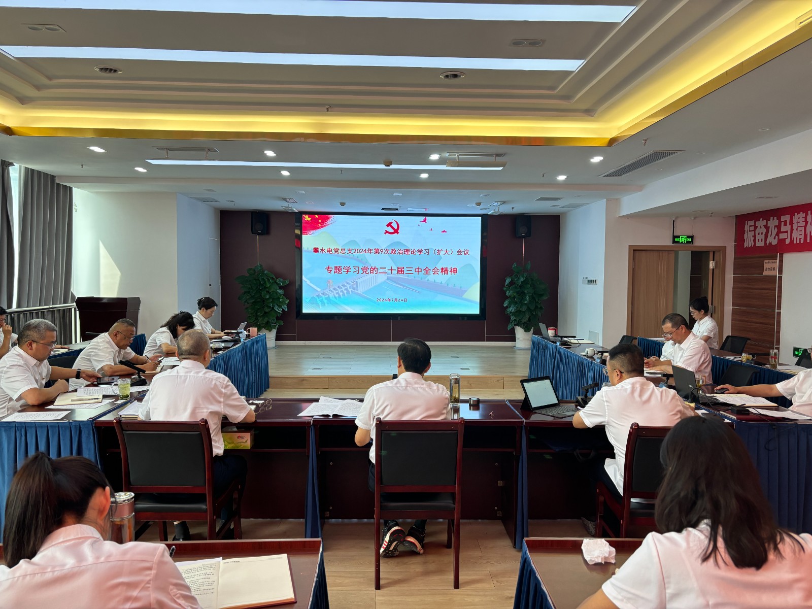 7月24日,攀水电公司党总支召开2024年第9次政治理论学习(扩大)会议,专题传达学习党的二十届三中全会精神,会议由红桃视频 副总经理、攀水电公司党总支书记、董事长徐孝刚主持,公司党总支政治理论学习会成员、全体中干、支部书记、其他党员、统战对象、入党积极分子共计30余人参加学习。