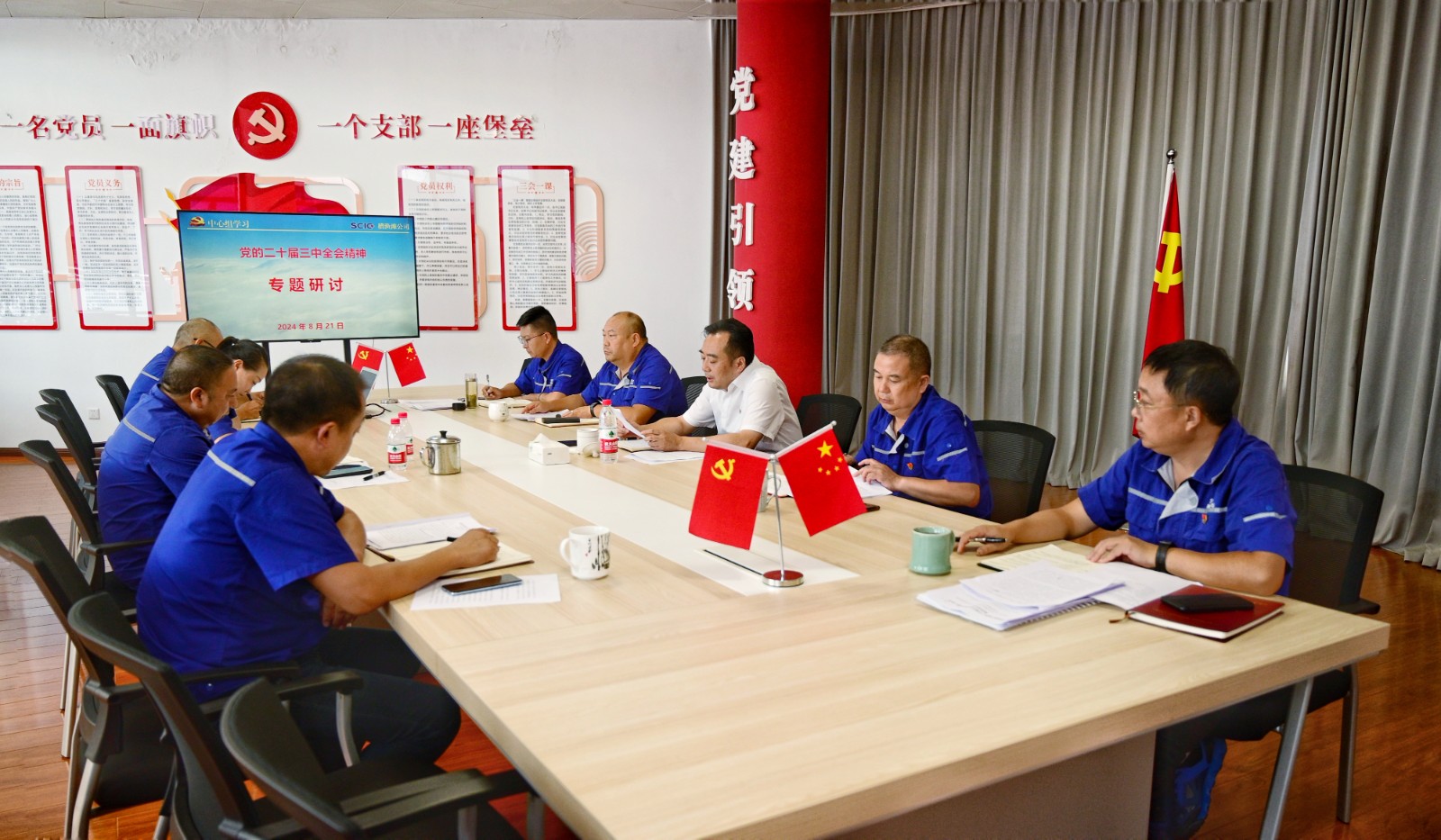 8月21日,槽渔滩公司党委召开2024年第8次理论学习中心组学习(扩大)会暨“党的二十届三中全会精神”专题研讨会,川投电力党委书记、董事长杨涛列席旁听并现场指导。会议由公司党委书记、董事长何光富主持。
