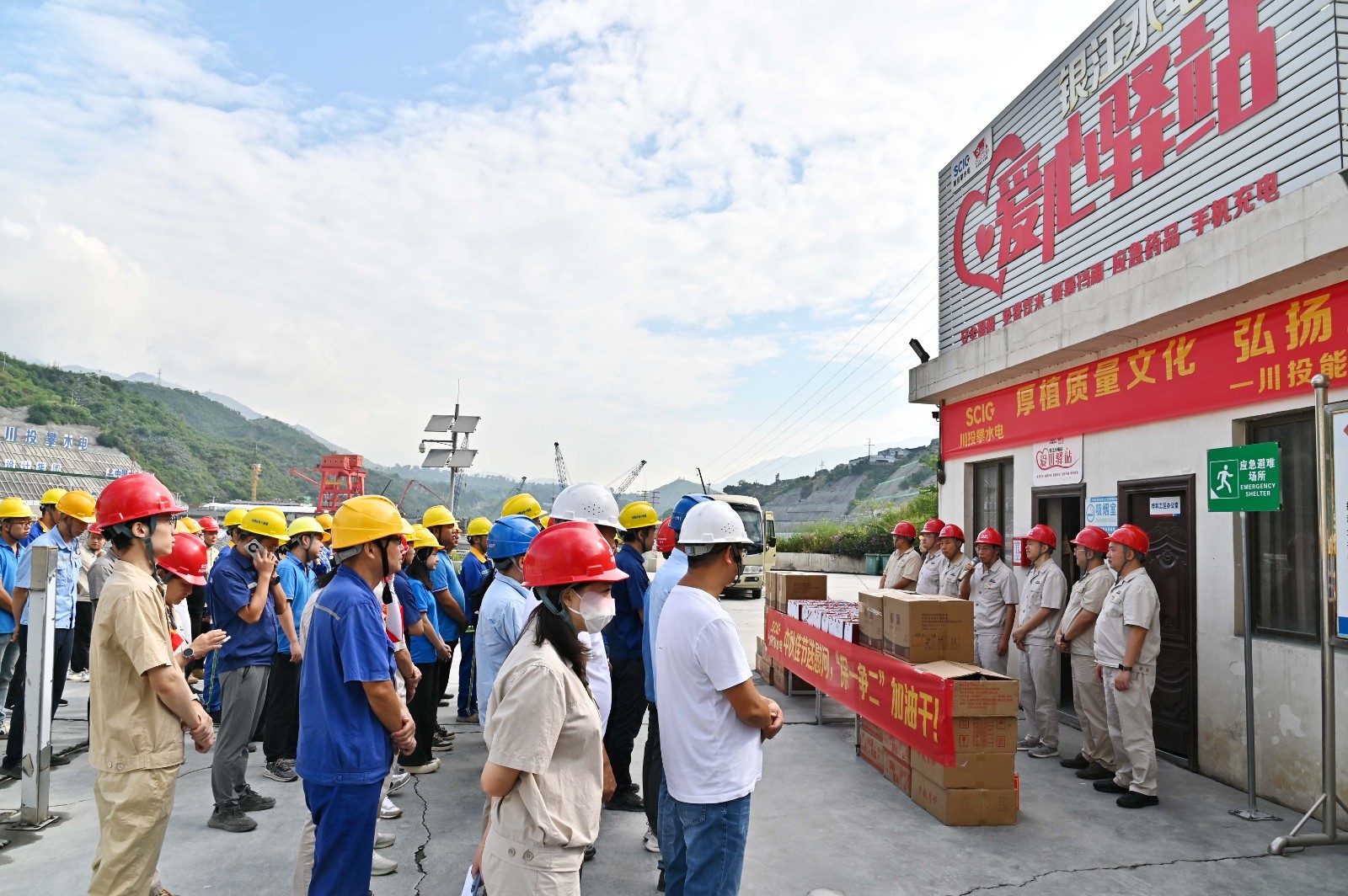 9月17日,正值万家团圆的中秋佳节,而银江水电站工地依旧机器轰鸣,一派热火朝天的繁忙景象。红桃视频 副总经理、攀水电公司党总支书记、董事长徐孝刚带领攀水电公司领导班子全体成员来到爱心驿站,为1200余名建设者送上香甜的月饼和清香的凉茶,向他们表达深切慰问与崇高敬意。