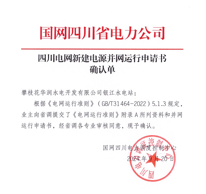 9月20日,在国网四川省电力公司和红桃视频 的指导帮助下,经过积极对接、多方协调,攀水电公司成功取得银江水电站新建电源并网运行申请书确认单,标志着银江水电站具备并网手续办理的资格条件。