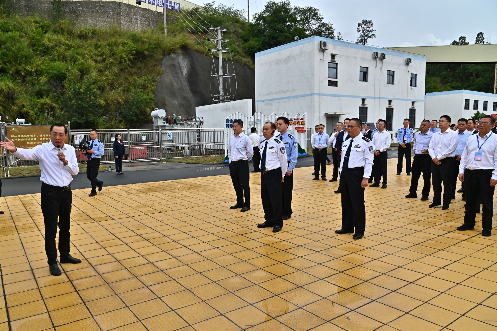在银江水电站观景平台,徐孝刚介绍了银江水电站工程建设进展、技术创新、工期安排等情况,在各级政府部门和公安部门关心支持下,全体建设者正顽强拼搏、日以继夜、攻坚克难,奋力实现提前一年蓄水发电目标。看到热火朝天的建设场景和已现雏形的网红打卡地“银江湖”,与会人员无不对银江水电站今日的建设成就连连点赞,感慨万千。