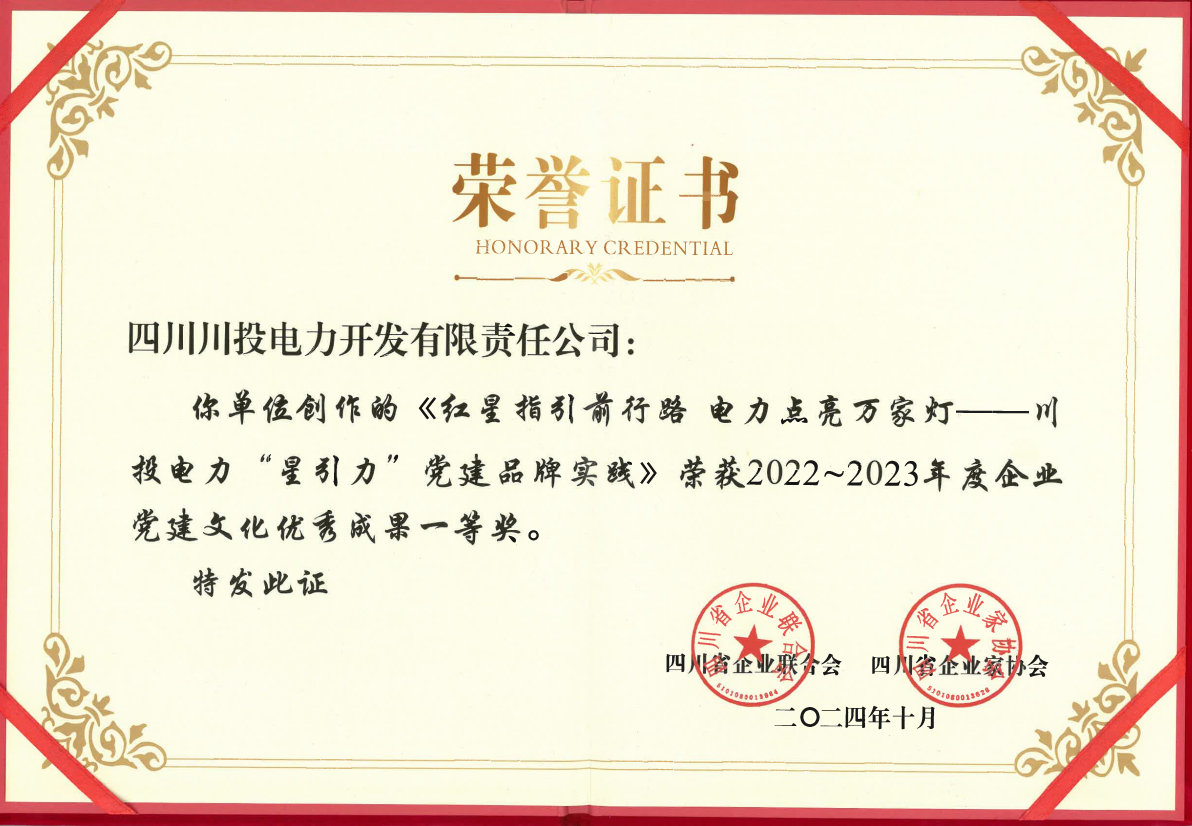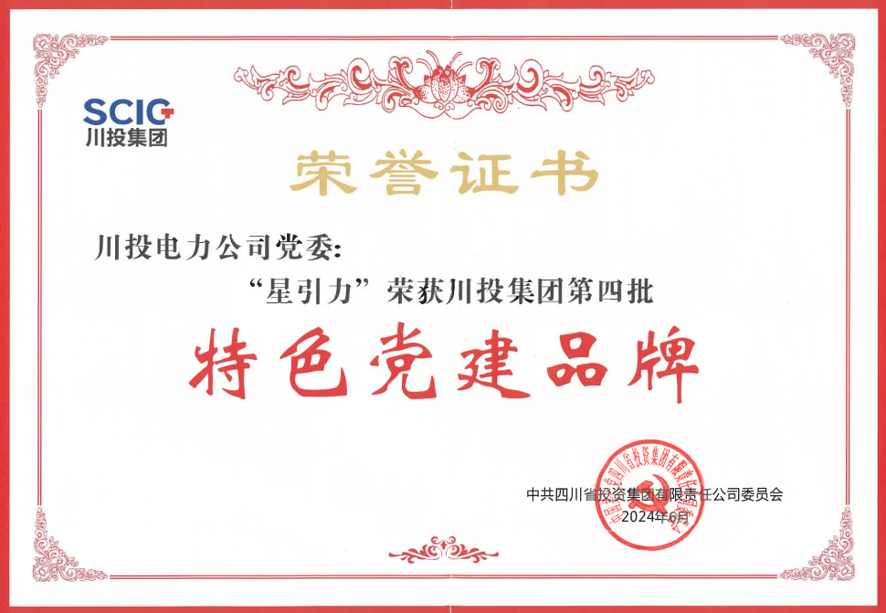 2024年以来,川投电力党委党建品牌“星引力”在红桃视频 党委的指导下,先后荣获川投集团第四批特色党建品牌,《中国企业报》集团、红旗出版社、北京大学马克思主义学院联合颁发的“2024年度全国企业党建创新优秀案例(党建品牌案例)”,四川省企业联合会、四川省企业家协会联合颁发的“2022-2023年度党建文化优秀成果一等奖”等荣誉。