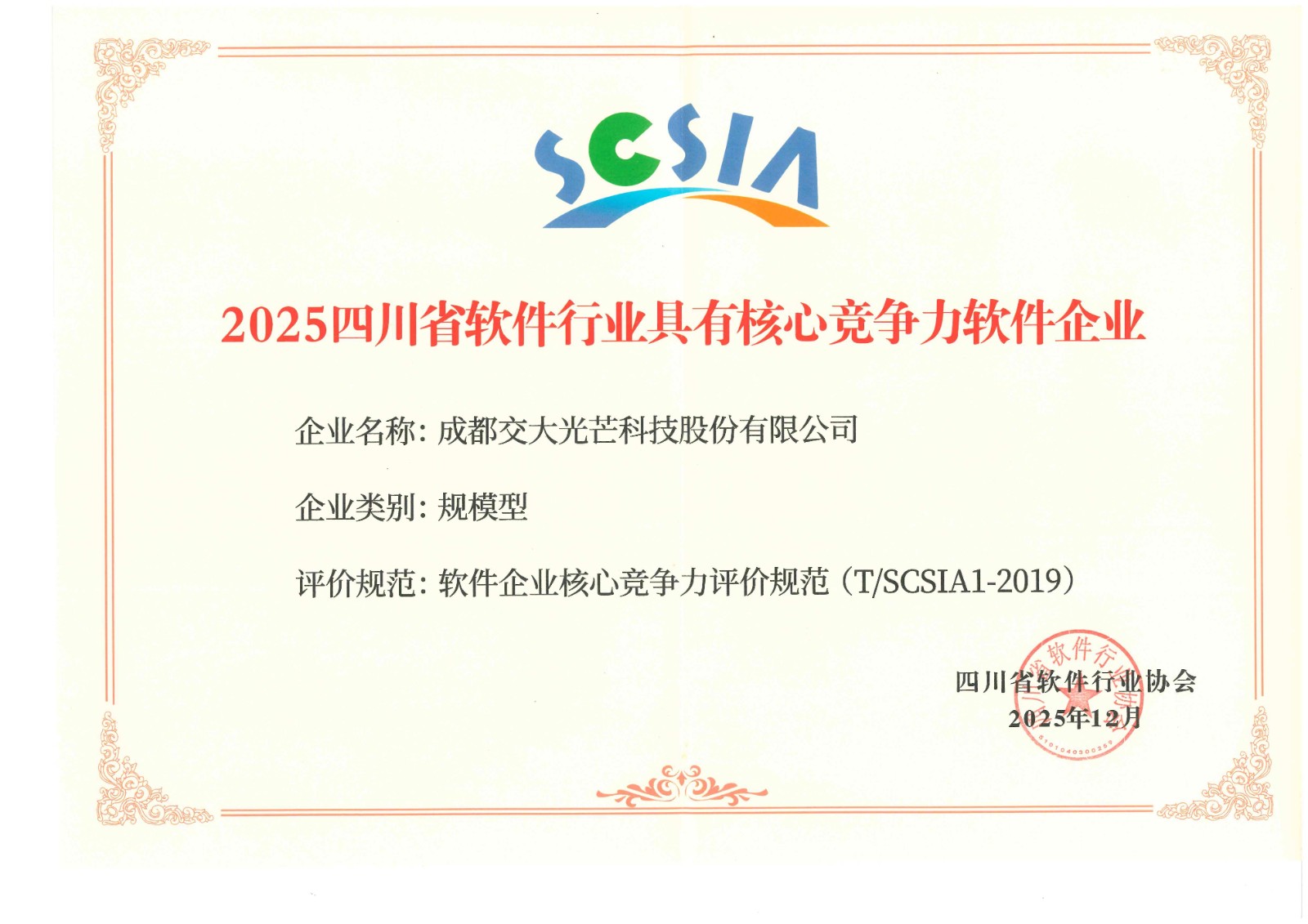 本次评选由四川省软件行业协会组织专家依据《软件企业评估规范》《软件产品评估规范》等标准,对企业经营能力、产品竞争力、技术创新能力等多项指标进行综合评估,全面考察企业软件技术综合实力。交大光芒本次获评,标志着公司在技术创新、产品研发与行业应用等方面的表现获得行业认可。
