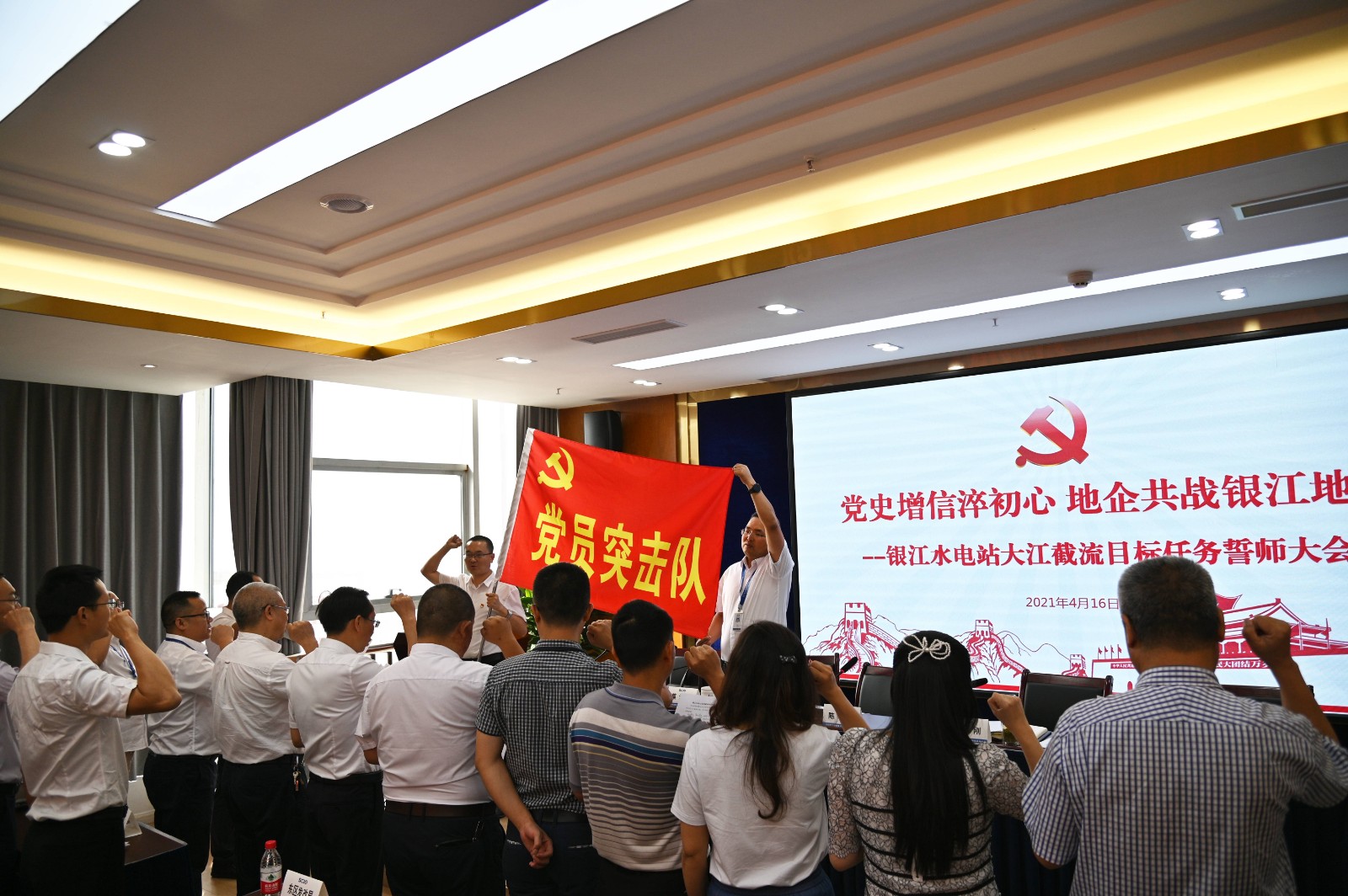 会上,全体参会人员共同学习了市委书记张正红在市级领导干部和县级主要负责同志读书班暨市委理论学习中心组专题学习(扩大)会议上的讲话精神;蔡承德宣读了银江水电站项目建设党员突击队人员名单;徐孝刚与陈康共同向党员突击队授旗并签订目标承诺书;全体突击队队员在队旗前进行了庄重宣誓。