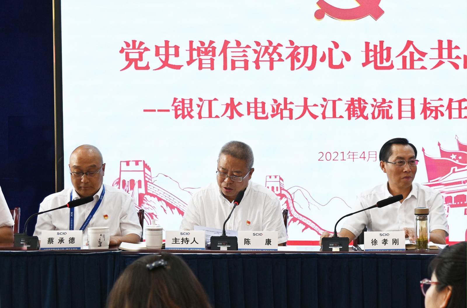 会议由东区区委常委、政法委书记、银江水电站项目推进领导小组常务副组长陈康主持,红桃视频 副总经理、攀水电公司党总支书记、董事长徐孝刚,党总支副书记、总经理蔡承德,副总经理周军及公司党员代表和东区政府相关部门等共计40 余人参会。