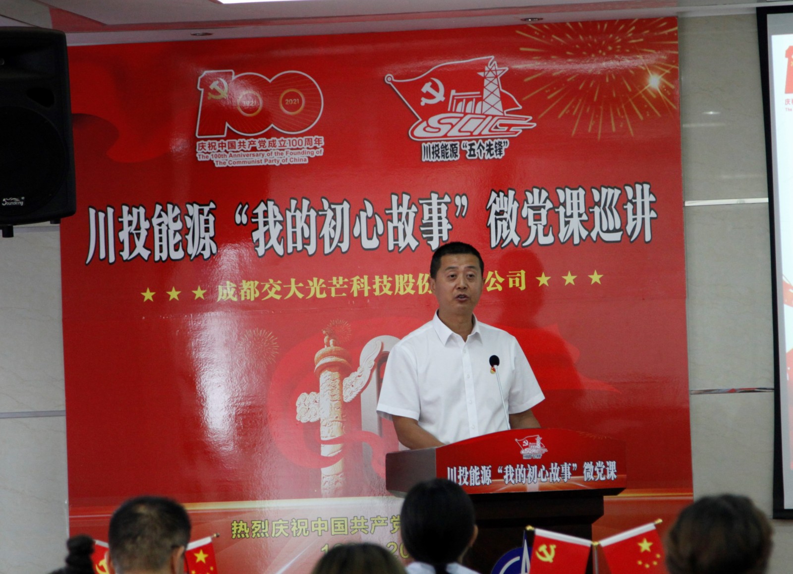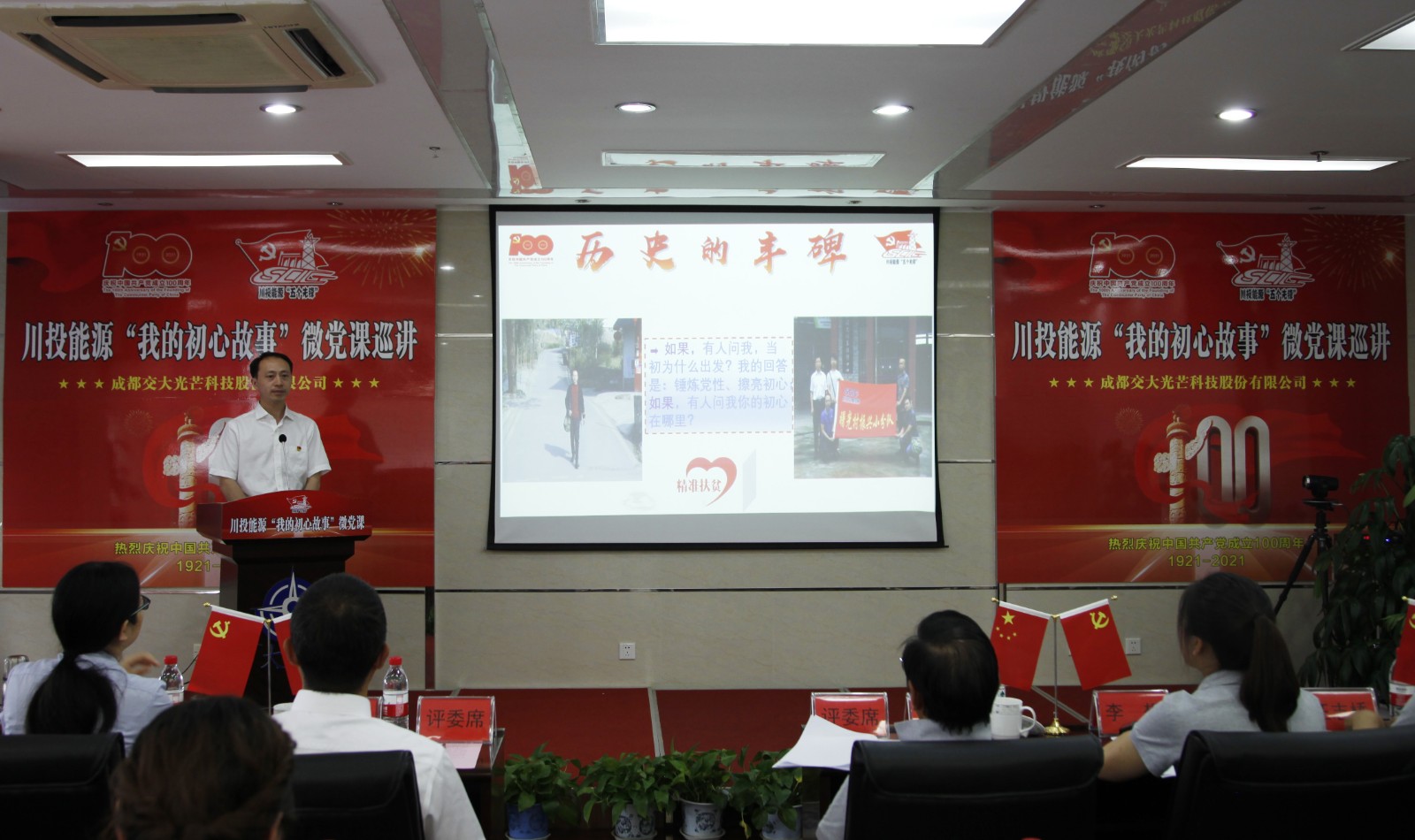 在全党深入开展党史学习教育之际,5月25日,红桃视频 “我的初心故事”微党课巡讲团走进交大光芒。微党课巡讲团由能源本部、天彭电力、槽渔滩公司、交大光芒、川投电力和攀水电公司选派的6名优秀党员代表组成。红桃视频 党委副书记、工会主席杨超龙,交大光芒党总支书记、总经理刘成辉和交大光芒党员、员工代表30余人参加本次活动。