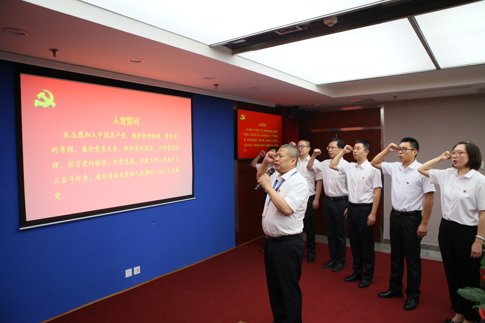一段誓词许下庄严承诺。大会在激昂高亢的国歌声中拉开帷幕。随后,公司党委书记、副董事长、总经理杨洪带领新老党员,郑重地举起右手,面对党旗庄严宣誓,在主会场内、在彭州龙门山下、在洪雅青衣江畔、在银江攀西高原之上,响彻起共产党人的铮铮誓言。