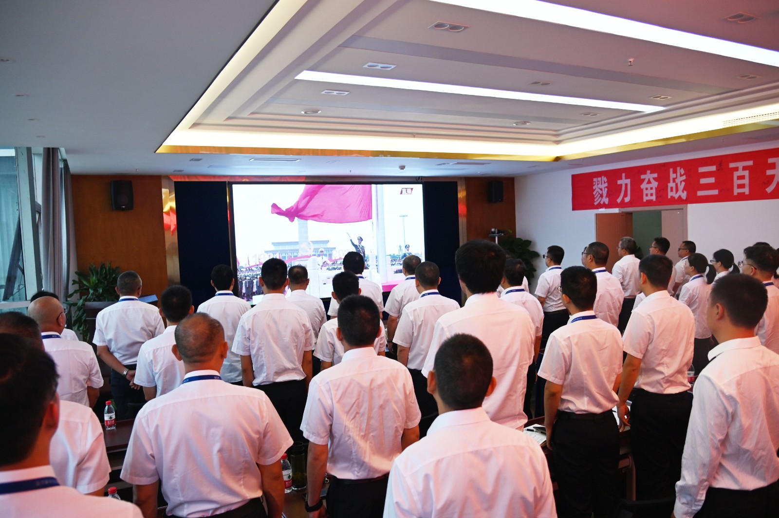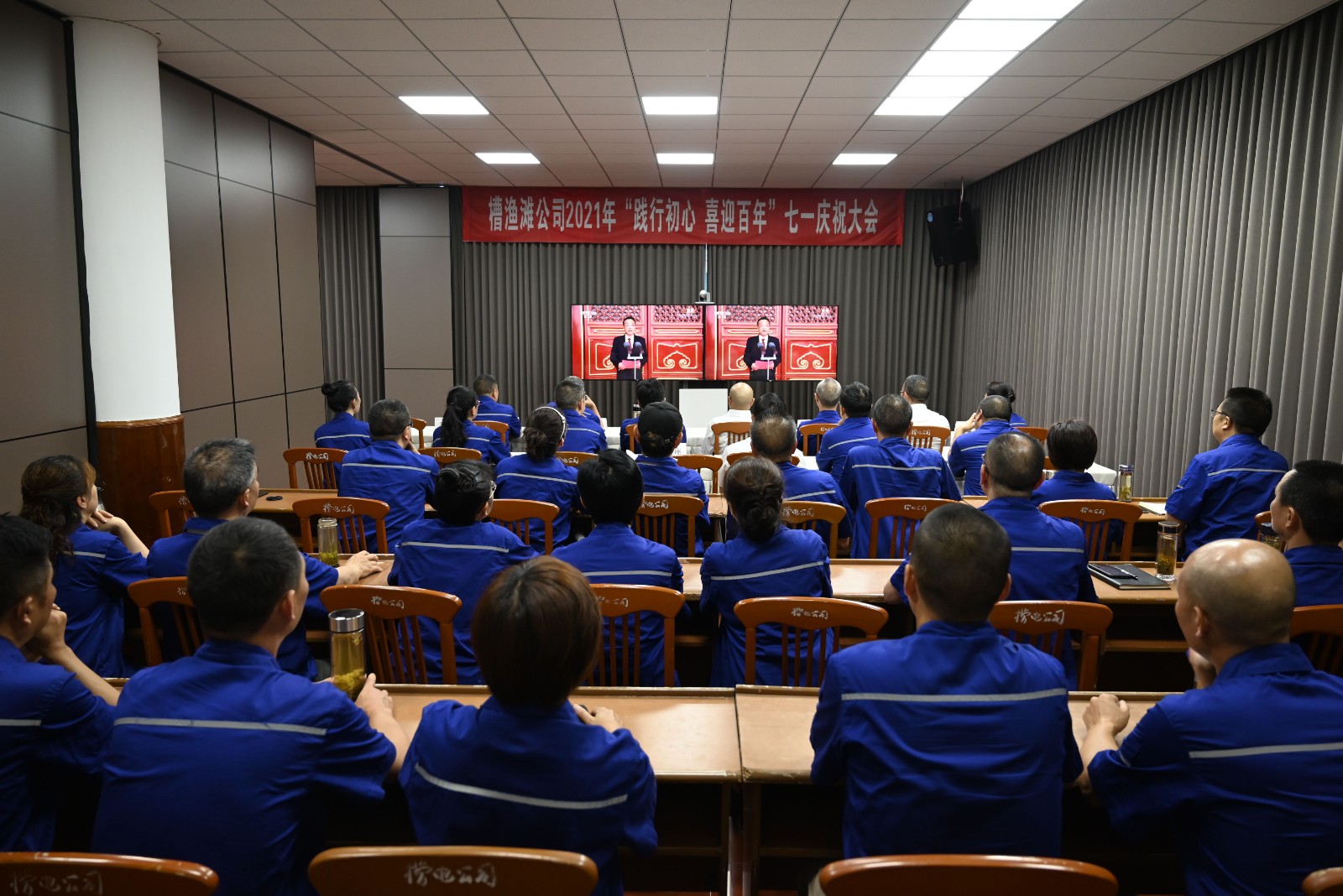视频中,习近平总书记铿锵有力的声音深入人心,从1921到2021,中国共产党带领中国人民,从风雨飘摇中一路走来,百年征程波澜壮阔,百年初心历久弥坚。当《国歌》《国际歌》相继响起的时刻,会场人员纷纷起立,跟随激昂的旋律整齐高唱。当回顾“四史”赞颂党的伟业之时,会场人员满溢出对党的感恩和身为党员的自豪。