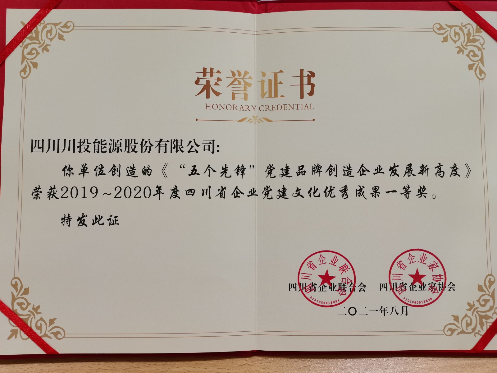 公司“五个先锋”党建品牌获得2019-2020年度四川省企业党建文化优秀成果一等奖1